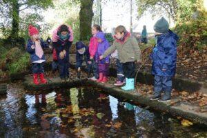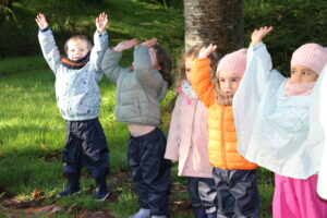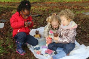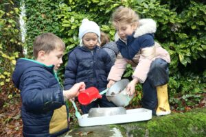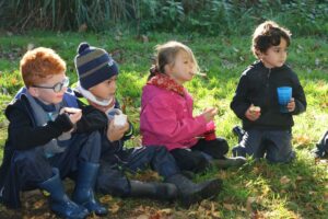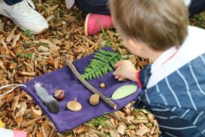 Faire l’école dehors, c’est partager un goûter sous un arbre, jouer à la dînette avec des éléments naturels, construire des cabanes ou un pont pour traverser le fossé, jouer à cache-cache ou au loup, réaliser une chasse aux trésors d’automne, collectionner des brindilles et les ranger par ordre croissant : autant d’occasion de développer ses 5 sens, vivre l’entraide, le faire-ensemble, respecter le vivant et affiner son observation.